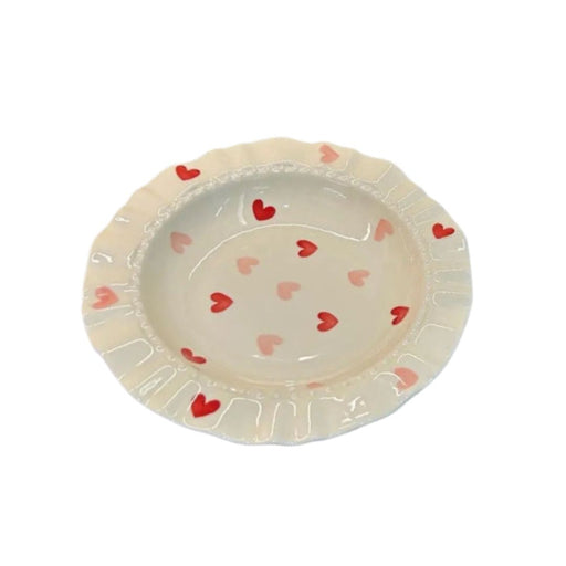 Original price $39.95 - Original price $39.95Original price$39.95$39.95 - $39.95Current price $39.95| /Our Amore Ruffled Dish features a creamy ceramic adorned with a scattering of hand-painted tonal red and pink hearts and a textured ruffled rim. We...